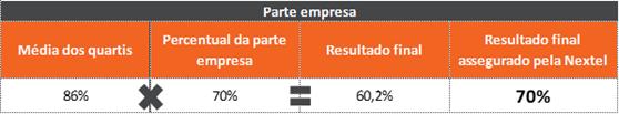 Considerando que o percentual de atingimento correspondente à parte empresa é de 70%, o atingimento final resultou em 60,2% (86 X 0,7). No entanto, como forma de reconhecer e recompensar o excelente desempenho dos colaboradores, a Nextel decidiu assegurar o resultado final do componente empresa em 70%.