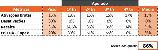 A Nextel divulgou o resultado referente à média dos 4 trimestres (quartis) de 2016. A média do período ficou em 86%, conforme demonstra a tabela abaixo: